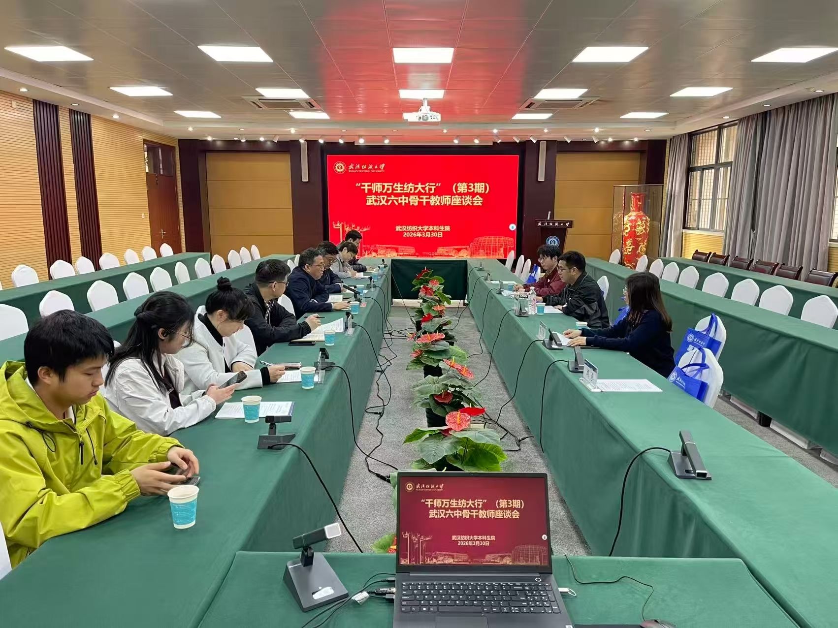 为深化大中协同,搭建基础教育与高等教育联动发展桥梁,3月30日,“千师万生纺大行”系列活动(第 3 期)在学校阳光校区顺利开展。武汉六中高一年级党支部书记徐存吉一行来校调研交流,百余名师生倾听纺大故事感受纺大文化。本科生院、资产与实验室管理处、纺织科学与工程学院、外国语学院相关负责人参加相关活动。